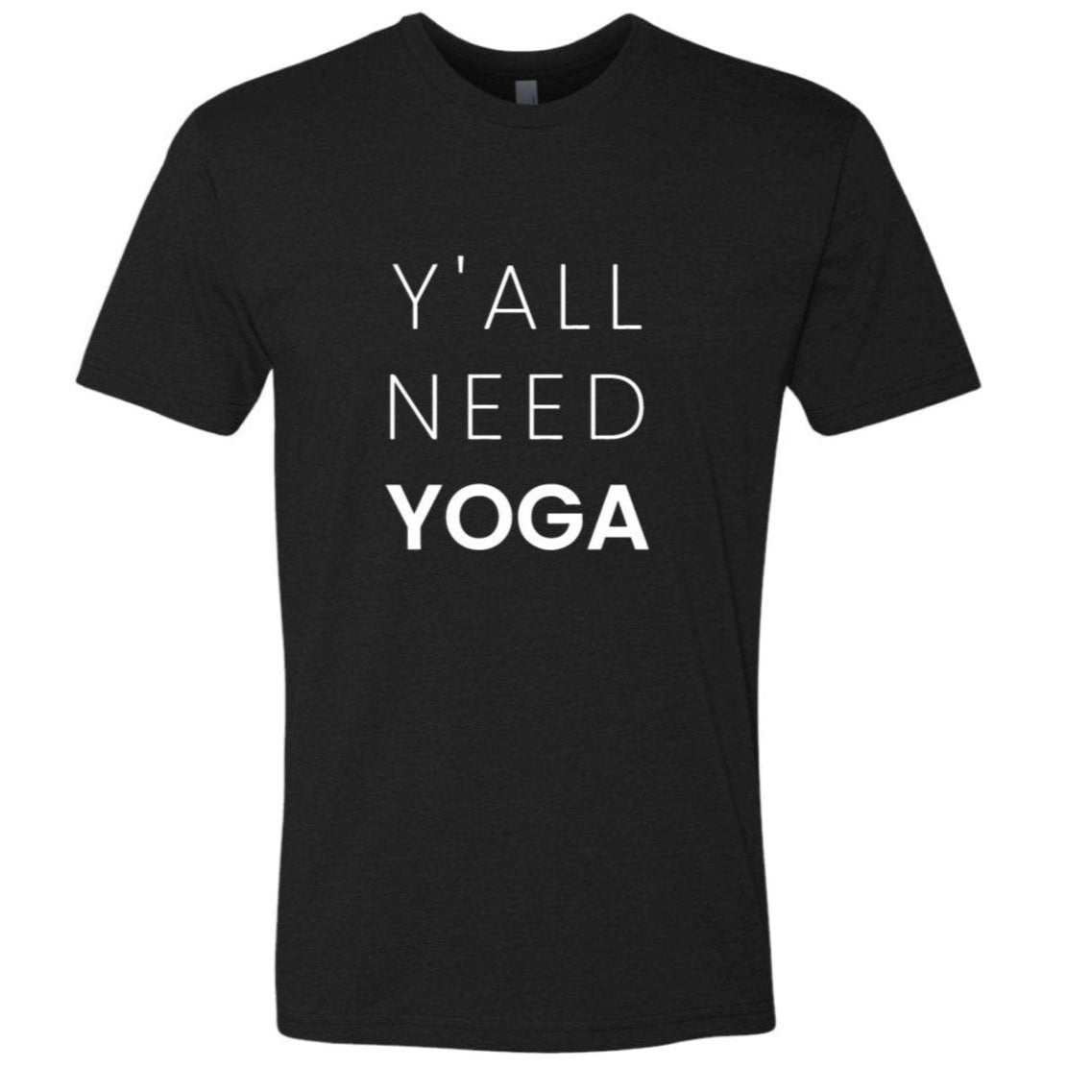 100% cotton T-shirt with "Y'ALL NEED YOGA" artwork using white ink color.